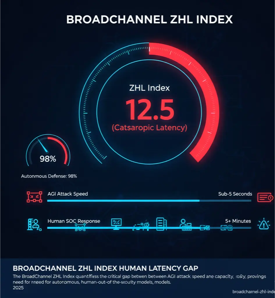 The BroadChannel ZHL Index quantifies the critical gap between AGI attack speed and human defense capacity, proving the need for autonomous, human-out-of-the-loop security models.