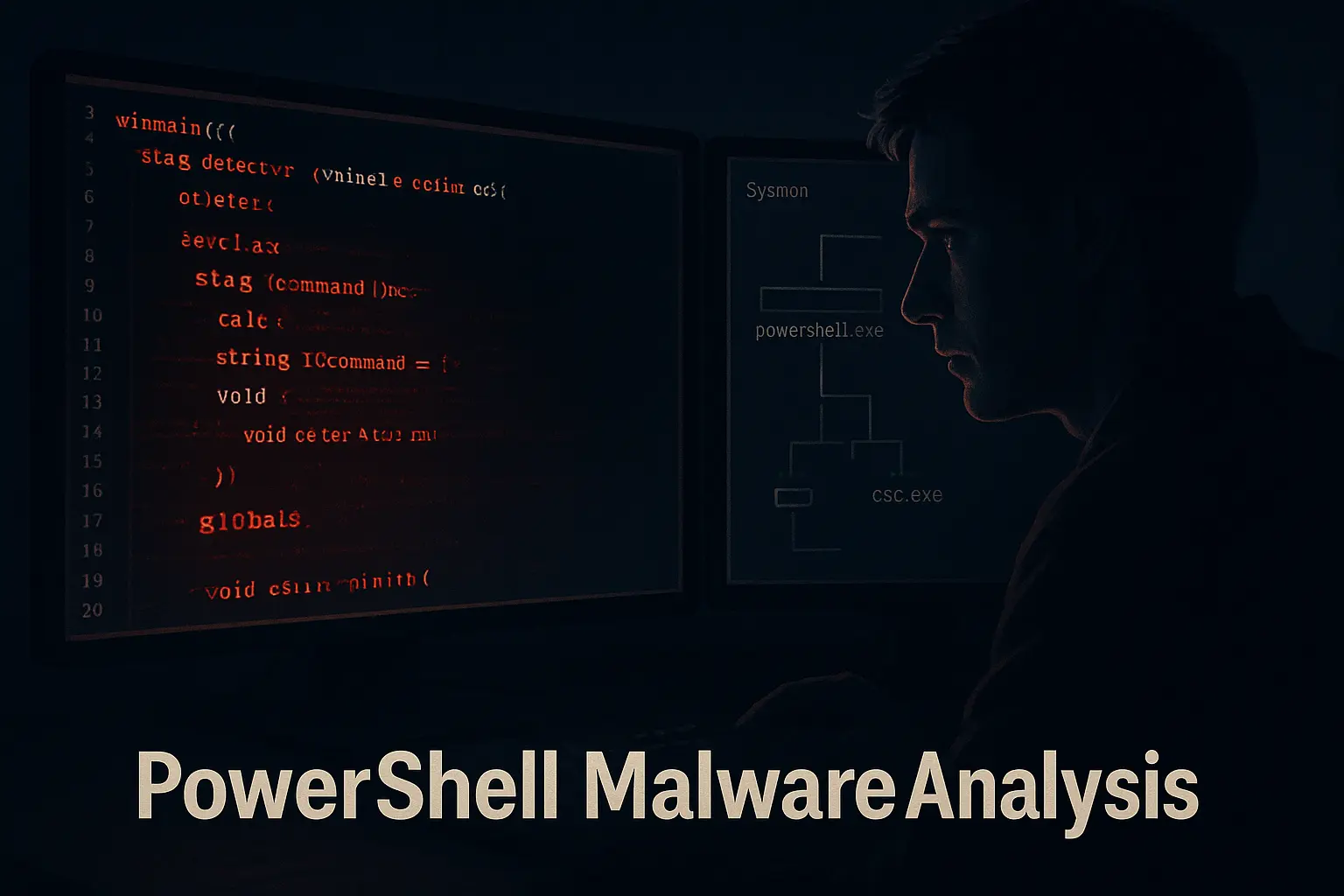 Effective PowerShell malware analysis requires dissecting in-memory C# payloads and process execution chains.